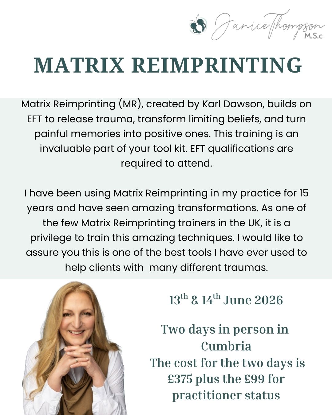 Matrix Reimprinting (MR) is a revolutionary new tool born out of EFT by Karl Dawson the creator of Matrix Reimprinting. It takes EFT to a whole new level. It allows for stuck trauma to be released where the trauma occurred. It helps people realise their own limiting beliefs that may have been affecting them negatively for many for years and allows for them to be transformed into positively supporting beliefs. It helps transform for old painful memories into supporting ones. Please note: you must have EFT qualifications to attend a Matrix Reimprinitng course.